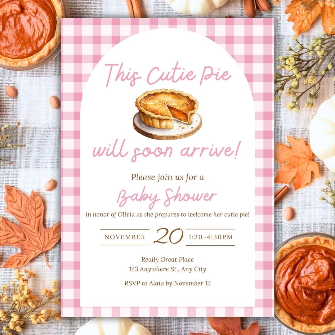 Celebrate your little cutie pie with these adorable editable Baby Shower Invitations! This pack includes 3 Baby Shower Invitation Templates featuring charming pie illustrations and gingham backgrounds in pink, blue, and cream neutral tones, perfect for any fall, autumn, or Thanksgiving-themed baby shower.