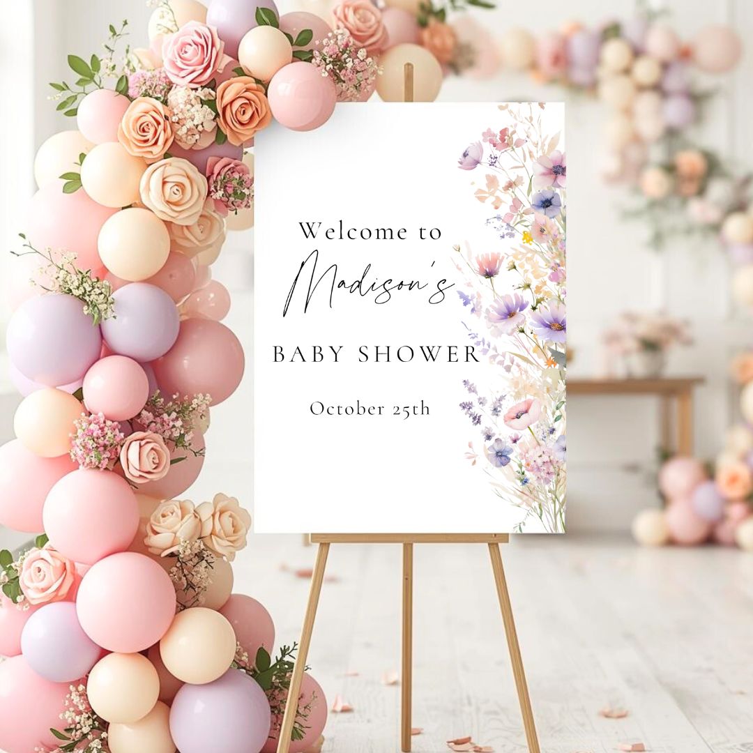 Welcome your guests in style with this Baby in Bloom Baby Shower Welcome Signs, beautifully decorated with wildflowers in soft pastel colors. The perfect first impression for your spring baby shower, garden baby shower, floral baby shower, or wildflower baby shower theme!